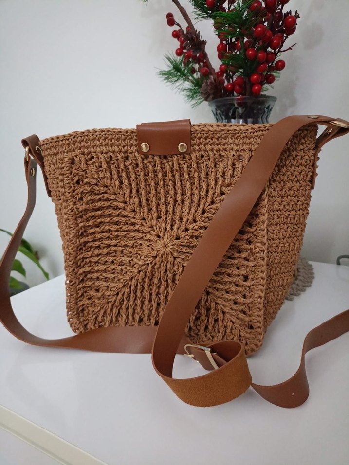 Bohem tarzda, açık kahverengi örgü kadın çanta, desensiz ve günlük kullanıma uygun.