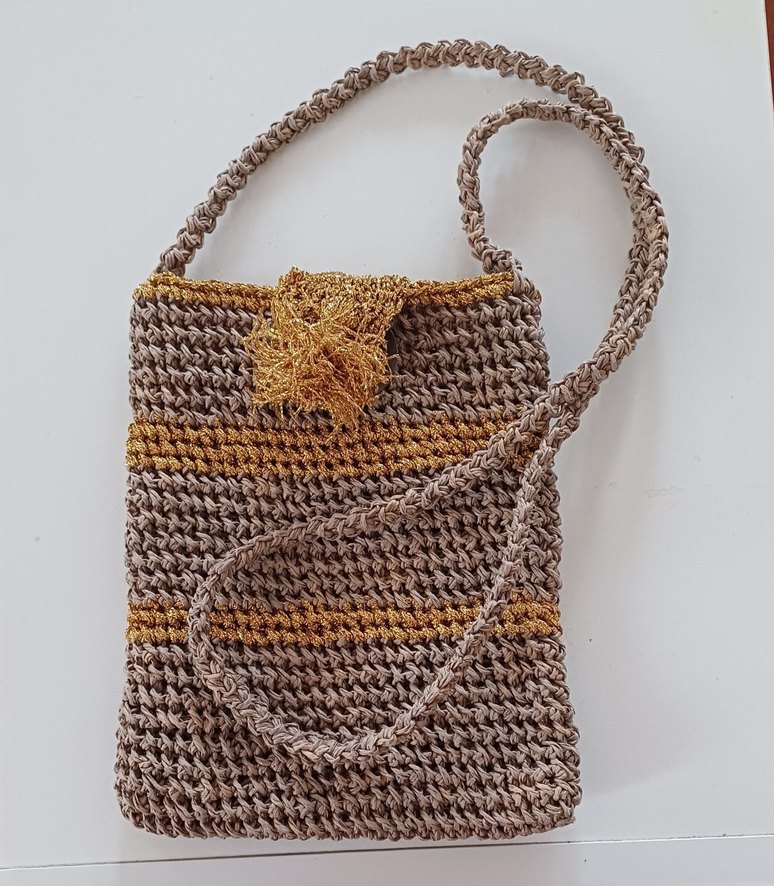 Kadınlar için örgü tasarımlı, kahverengi ve gri tonlarında bohem stilde çapraz çanta. Yumuşak örgü malzemesi ve desensiz görünümüyle günlük kullanıma uygun.