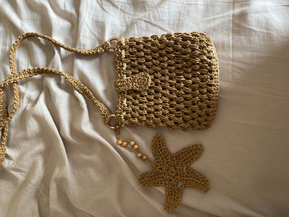 Kahverengi, işlemeli detaylı ve yıldız şeklinde süsü olan örme çapraz çanta, bohem tarzı yansıtır.