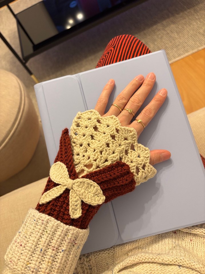 Bordo rengi kadın eldiveni, bohem tarzda, dekoratif fiyonk ve dalgalı kenarlarla sıcak ve retro bir görünüm sunar.