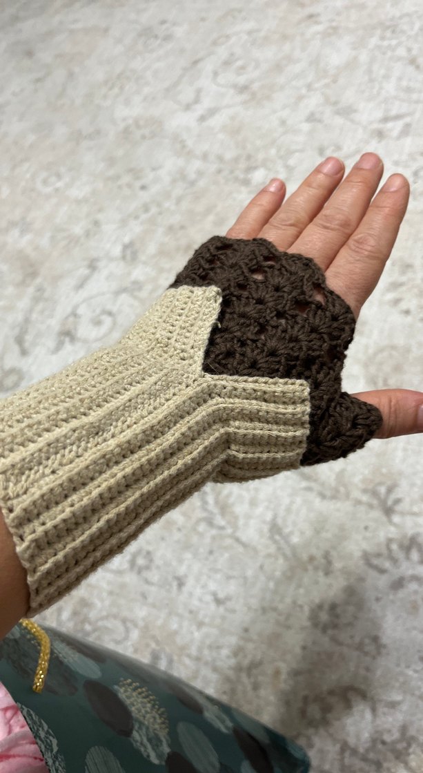 Bej ve kahverengi örgü kadın eldiveni, bohem tarzıyla rahat ve retro bir görünüm sunar. Hippie havası için ideal.