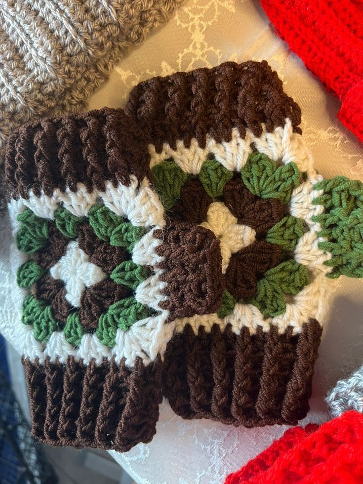Kadınlar için gri ve kırmızı renklerde, örgü bohem tarzda, retro çiçek desenli sıcak eldivenler. Hippie tarzına uygun.