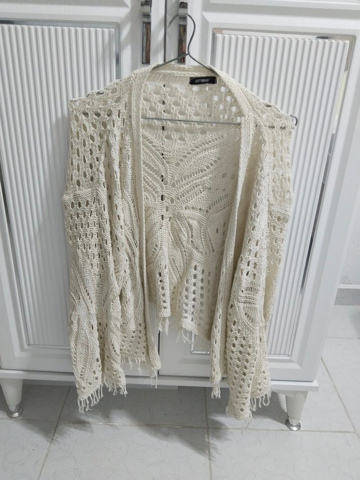 Bu beyaz örgü kadın hırka, bol kesim ve uzun kolludur. Bohem tarzda, desensiz ve midi boydadır. Günlük kullanım için uygundur.