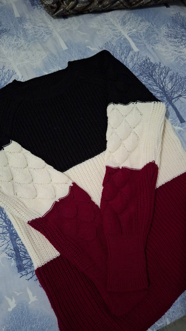 vişne rengi, siyah ve beyaz renklerde örülmüş, bohem tarzda, uzun kollu ve vücuda oturan kadın kazak. Rahat ve sıcak dokusu günlük kullanıma uygundur. Beden M fakat S ve L bedene de uyumludur. kusursuzdur