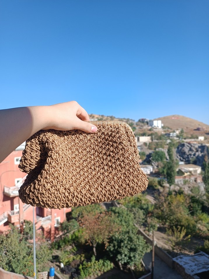 Açık kahverengi örgü kadın portföy çanta, rahat bohem tarzıyla dış mekan kullanımı için uygun. Desensiz, doğal bir görünüm sunar.