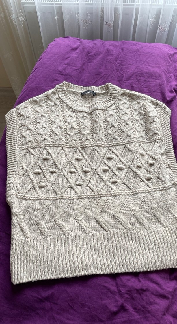 Yuvarlak yaka, kolsuz örgü süveter. Bohem tarzı, rahat kesim ve dokulu desene sahip, yumuşak beyaz renkte örülmüş. Günlük kullanıma uygun.