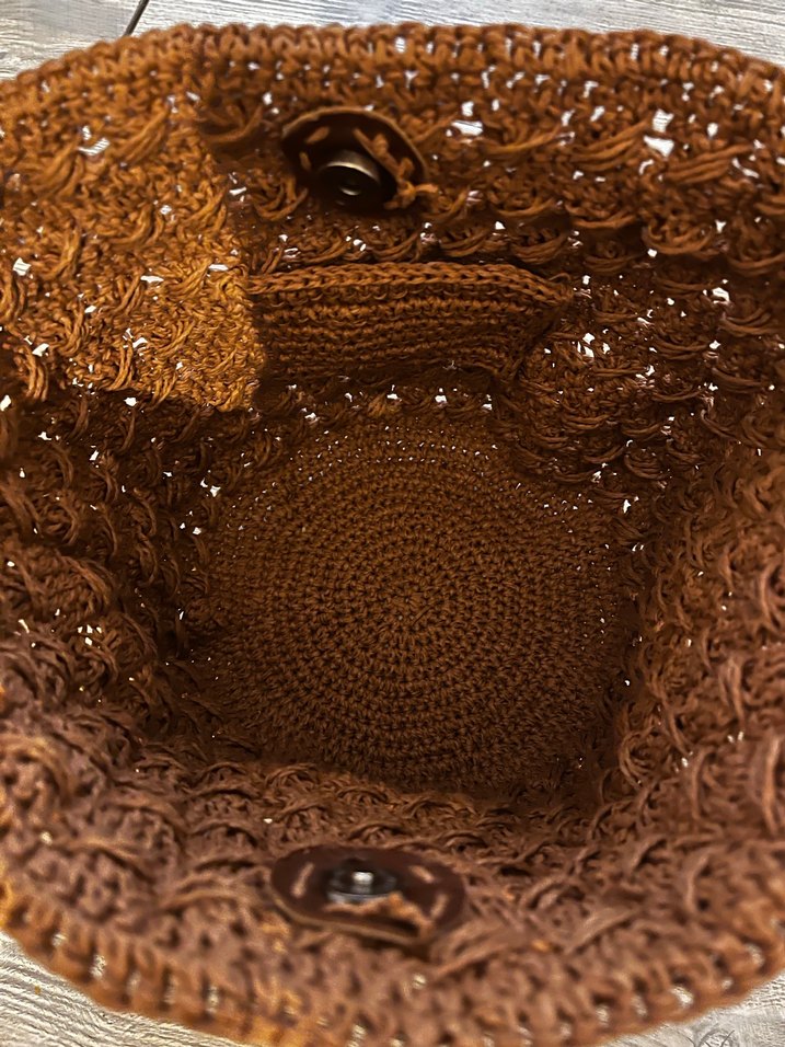 Kahverengi, işlemeli örgü detaylı bohem tarzda kadın çantasıdır. Dış mekan kullanımı için uygundur ve yumuşak örme kumaşa sahiptir.