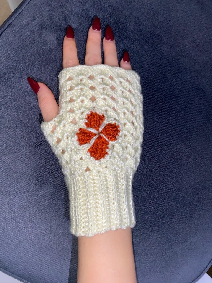 Hafif beyaz renkli, bohem tarzda, turuncu çiçek detaylı, örgü parmakları açık kadın eldiveni. Rahat ve retro bir görünüm sunar.