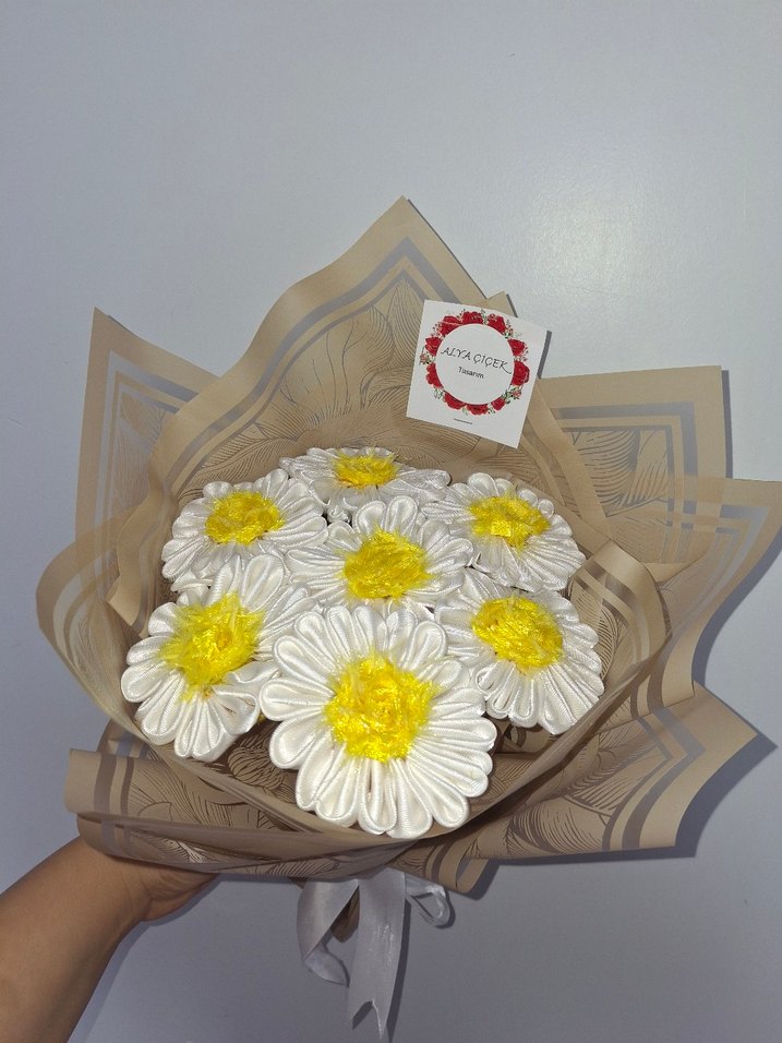 Bohem tarzda, beyaz yapraklı ve sarı merkezli çiçeklerden oluşan buket, kahverengi dekoratif kağıtla sarılmıştır.