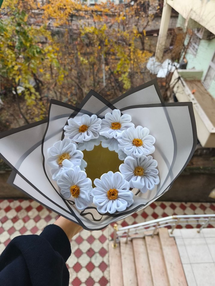 Bohem tarzda, el yapımı beyaz papatyaların dairesel düzenlendiği, siyah kenarlı şeffaf kağıda sarılı çiçek demeti.