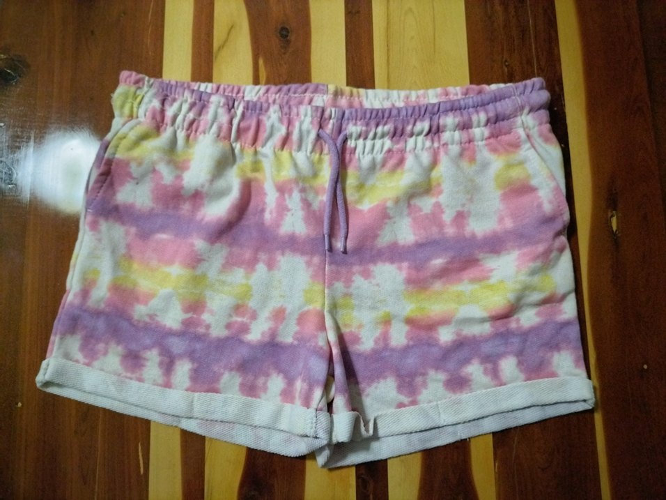 Pamuklu, pastel renkli tie-dye desenli, bol ve mini boy hamile şortu. Rahat ve şık, açık hava kullanımı için uygundur.