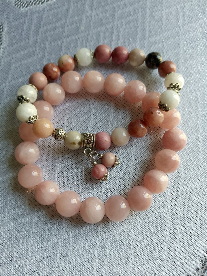 Bohem tarzda, pastel pembe boncuklardan oluşan kadın bilekliği. Farklı boyutlarda boncuklar ve metal detaylar içerir, günlük kullanıma uygundur.