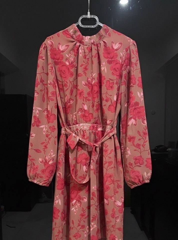 Bohem tarzda, yüksek yakalı ve uzun kollu, kemerli bel kısmıyla bol kesim uzun elbise. Yumuşak sentetik kumaştan, pastel pembe çiçek desenli. 38 beden . Sirti dekoltelidir