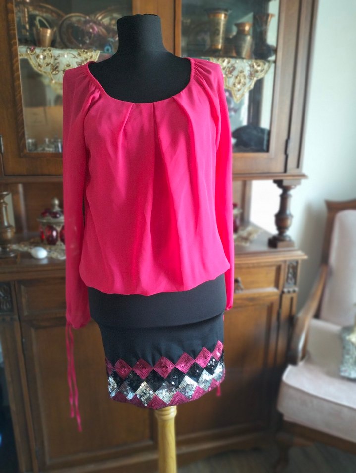 Bohem tarzda, uzun kollu, drapeli ve nakış detaylı koyu pembe Yuvarlak yaka ve kısa boyda, romantik akşamlar için uygundur.
