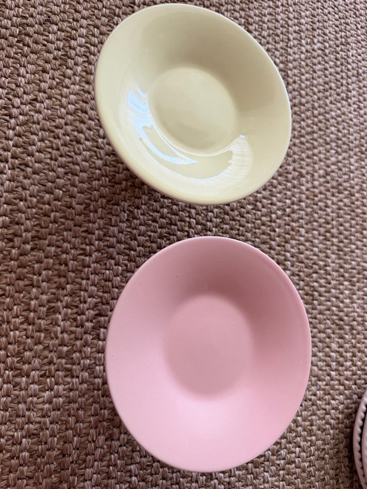 Pastel pembe ve sarı renklerde, desensiz, bohem tarzda iki adet tabak seti. Şık ve sade masa düzenine uygun. ️