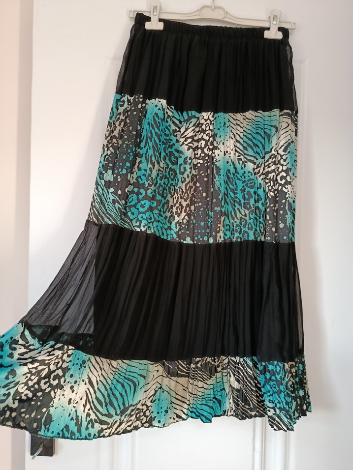 Bohem tarzda, pileli ve bol kesimli uzun etek. Koyu turkuaz desenli ve siyah panellerle kombinlenmiş, yumuşak sentetik kumaştan, dış mekan kullanımı için uygun.