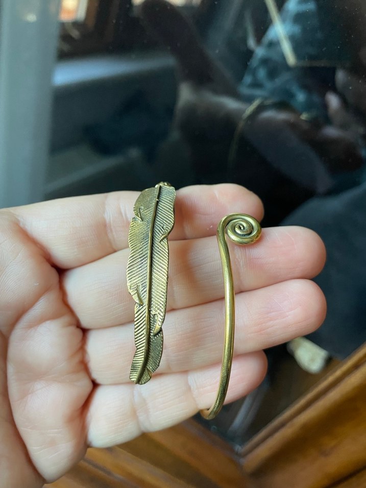 Günlük kullanıma uygun, tüy ve spiral detaylı altın renkli bohem kadın pirinç bileklik