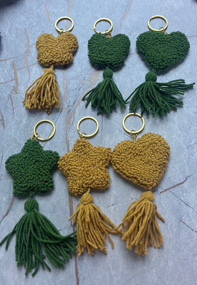 Kalp ve yıldız şekilli, yeşil ve hardal renklerinde, püsküllü bohem tarz kadın anahtarlık seti. Rahat ve renkli görünüm için uygundur. Adet fiyatıdır