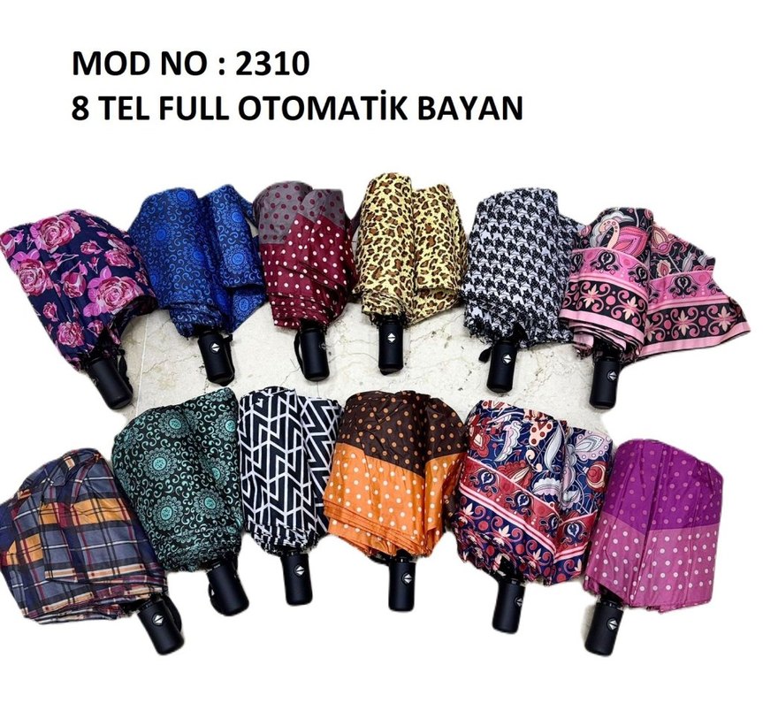 Koyu ve canlı çok renkli desenlere sahip bohem tarzı kadın otomatik şemsiye, püskül detaylı. Model no: 2310. ☂️