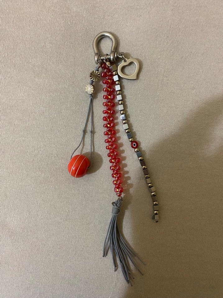 Bohem tarzda, kırmızı püsküllü, boncuklu ve metal detaylı kalp figürlü anahtarlık. Retro havası katmak için ideal.