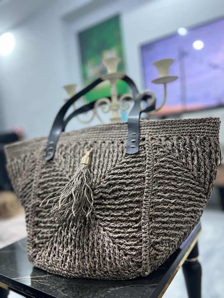 Bohem tarzda, örgü dokulu ve nakış desenli kadın çantası. Püskül detayı ve siyah saplarıyla günlük kullanıma uygun kahverengi tonlarda.