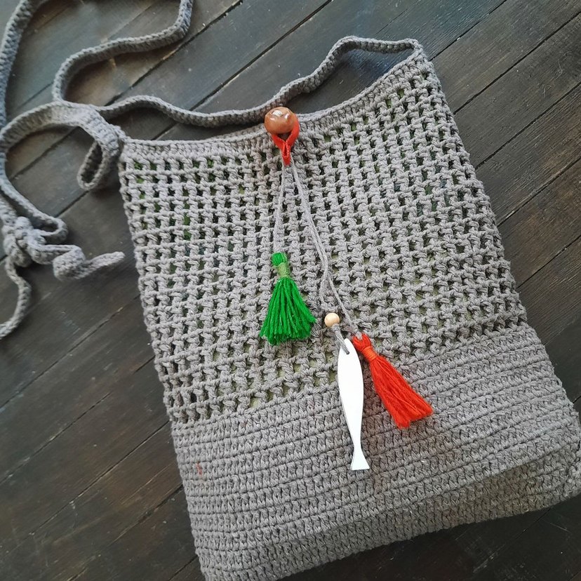 Koton ip ile örülmüş kahverengi delikli örgü çanta. Günlük hayatta ve özel günlerde kullanabiliceğiniz çok amaçlı, kullanışlı bir çanta. İçinde 2 küçük (telefon, gözlük sığabilecek) ve 1 büyük cebi vardır. Yıkanabilir. Sapı ayarlanabilir, çapraz kullanıma uygundur. Ağız kısmı avokado çekirdeğinden elde yapılmış bir düğme ile kapatılmaktadır, Ön tarafında yün ip ile yaplımış 2 püskül ve 1adet ahşap balık figürü süs olarak kullanılmıştır. Boyut 24 X 29 cm