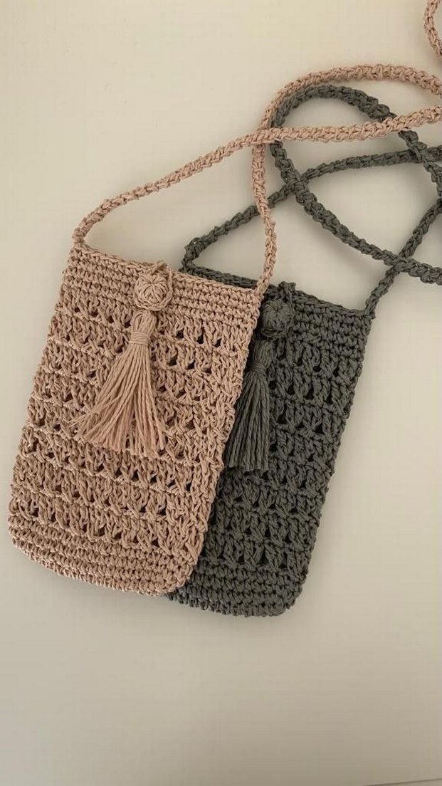 Bej ve gri renklerde, nakış desenli ve püsküllü örgü bohem tarz kadın çapraz çantalar. Günlük kullanıma uygun.