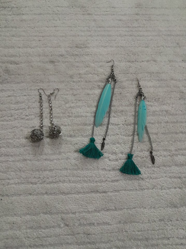 Bohem tarzda, turkuaz tüy ve püsküllerle süslenmiş, işlemeli detaylara sahip günlük kullanıma uygun küpeler.