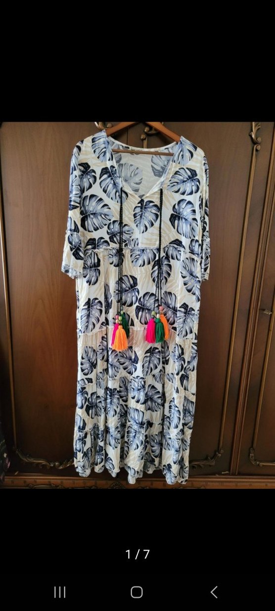 Bohem tarzı, bol kesim, V yakalı uzun elbise. Yumuşak kumaştan, çok renkli batik desenli ve renkli püsküllü. Günlük kullanım için uygundur.