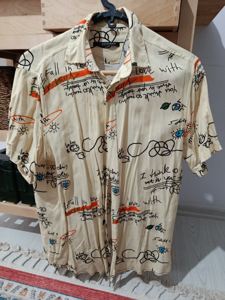 Kısa kollu, yakalı ve düğmeli, açık renkli bol kesim gömlek. El yazısı tarzı baskılar ve sembollerle süslenmiş, günlük rahat sokak giyimine uygun. Sadece bir defa kullanıldı.Boy 70 en 52 cm