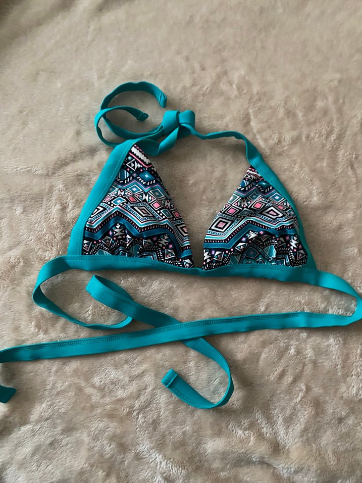 Turkuaz renkli, bağcıklı ve oturan kesimli bikini üstü, renkli tie-dye desenli ve boncuklu detaylara sahip, plaj için uygun.