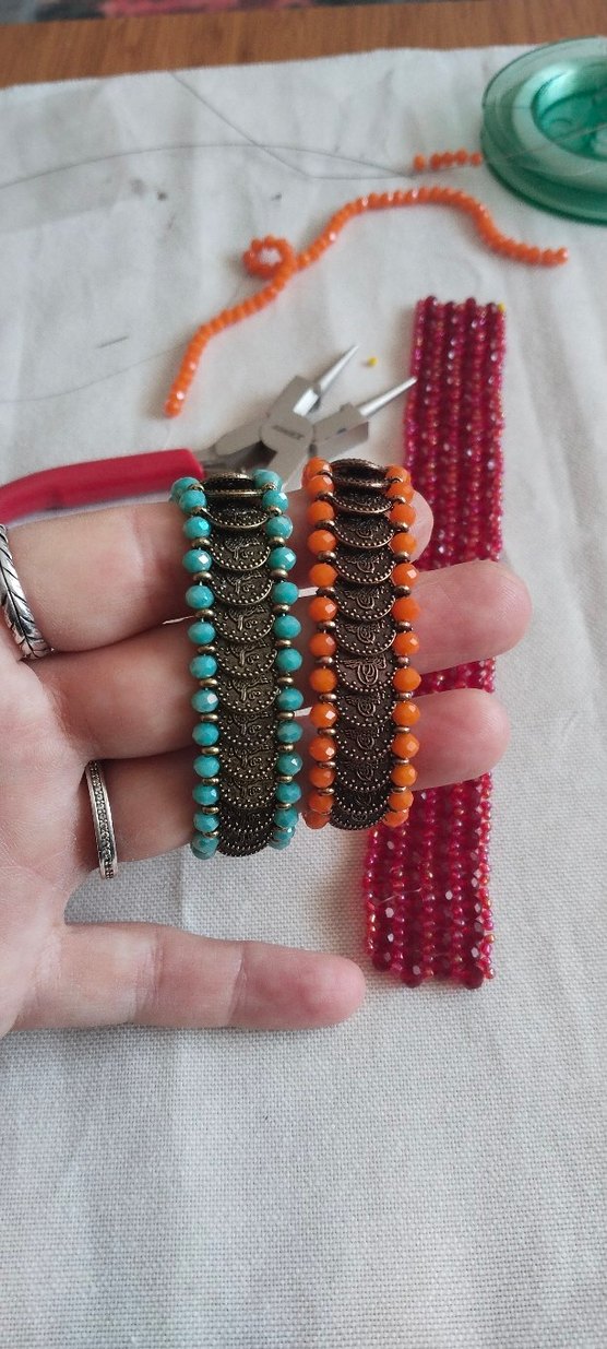 Bohem tarzda, turkuaz ve turuncu renkli boncuklu desenlere sahip kadın bileklikleri, günlük kullanım için uygun.