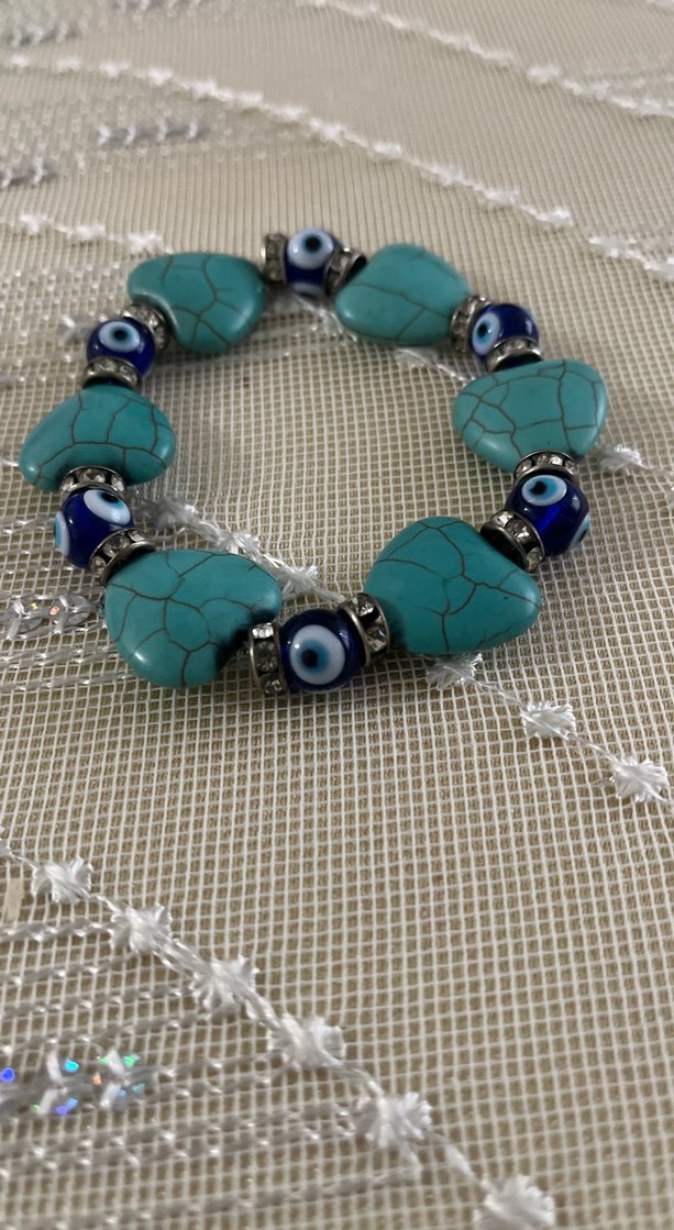 Bohem tarzda, renkli turkuaz boncuklar ve göz desenli bileklik, günlük kullanım için uygun.