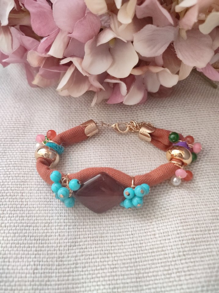 Bohem tarzda, renkli boncuklar ve turkuaz detaylı, bağlama desenli kumaş üzerine tasarlanmış bileklik. Günlük kullanım için uygundur.