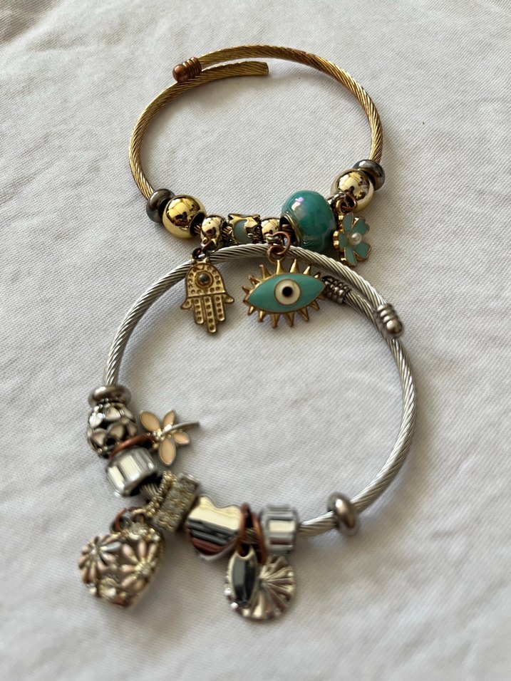 Renkli turkuaz ve metalik tonlarda boncuklu ve işlemeli detaylara sahip iki bohem tarzda kadın bilekliği, günlük kullanıma uygun.
