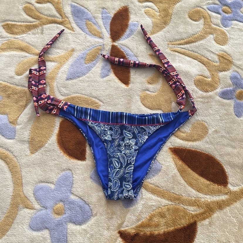 Kadın bikini altı, renkli bohem desenli ve askılı. Kuşaklı ve oturan kesimli, plajda kullanıma uygun.