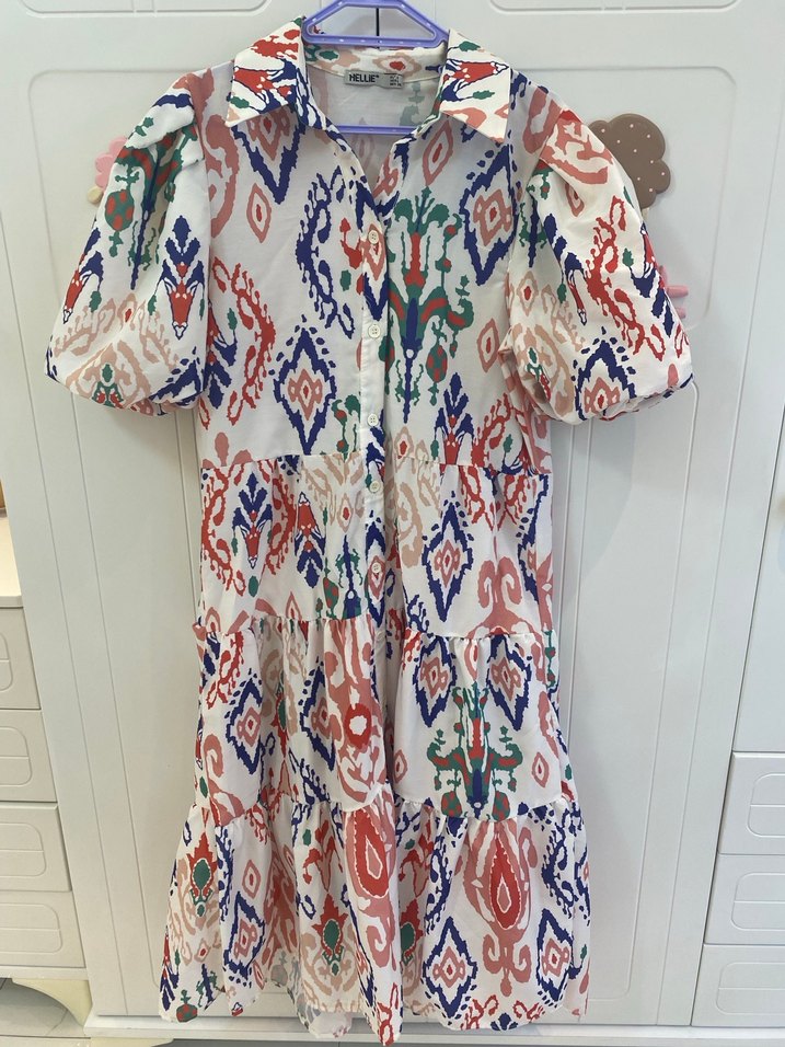 Bohem tarzda, kısa kollu ve V yakalı, bol kesim mini tunik. Çok renkli batik desenli, fırfırlı ve yumuşak sentetik kumaştan yapılmıştır. Günlük kullanım için uygundur.