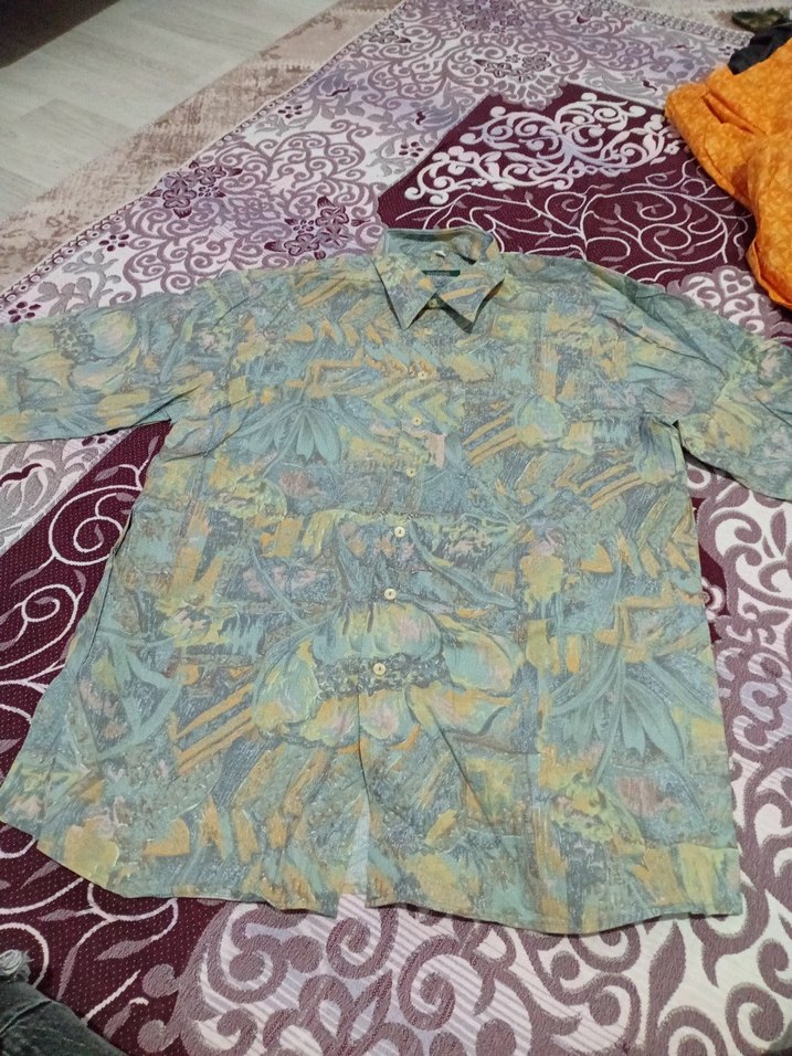 Bohem tarzda, kısa kollu, düğmeli ve yakalı erkek gömleği. Pastel çok renkli batik desenli, normal boyda ve bol kesimdir.