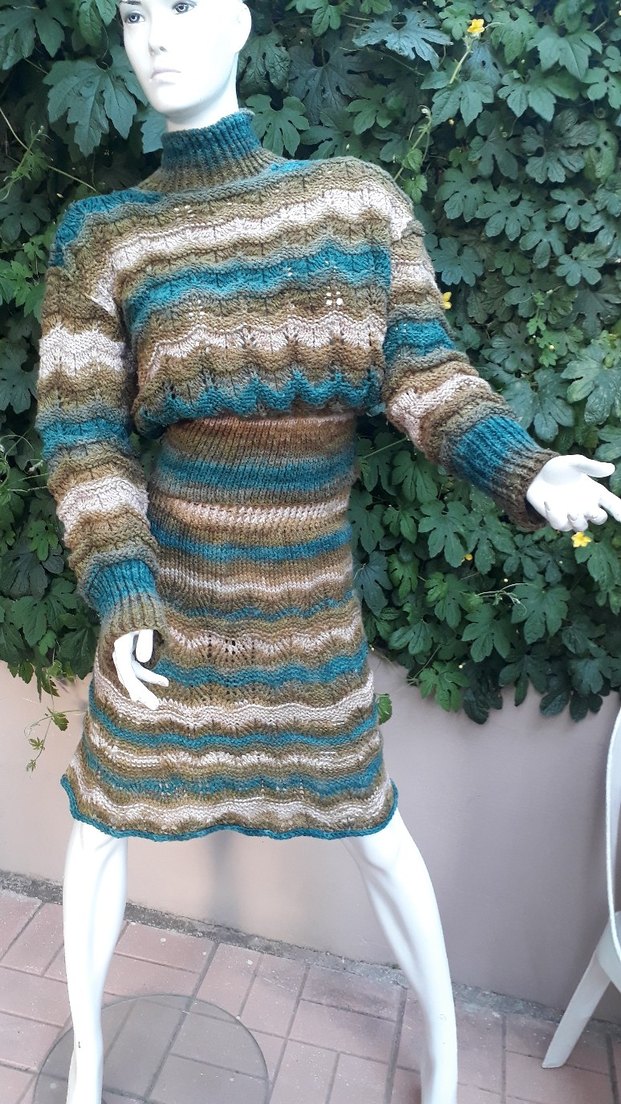 Kahve, krem, mavi ve yeşil renklerde, örgü, uzun kollu ve boğazlı, bol kesim renkli dalga desenli bohem tarzda kazak ve etek takım L, M ve S bedene uygundur. Manken S beden uyumludur. Alize Batik iple örülmüştür ve %25 yün içerir. Çekim, ışık ve açı dolayısıyla renk yanılgıları olabilir. Buharda ütü uygulanmıştır. İstenilen renklerde ve ebatta örülür. BU TAKIM SATILMIŞTIR. Sipariş alınır. İnternette görüp beğendiğiniz bir model varsa iletişime geçip onu da ördürebilirsiniz. İADE VE DEĞİŞİM KABUL ETMİYORUM. #coton #cotton #koton #baby #crop #büstiyer #bistüer #bluz #askılı #örgü #orgu #hand #made #el #yapım #motif #pamuk #merserize #akrilik #bohem