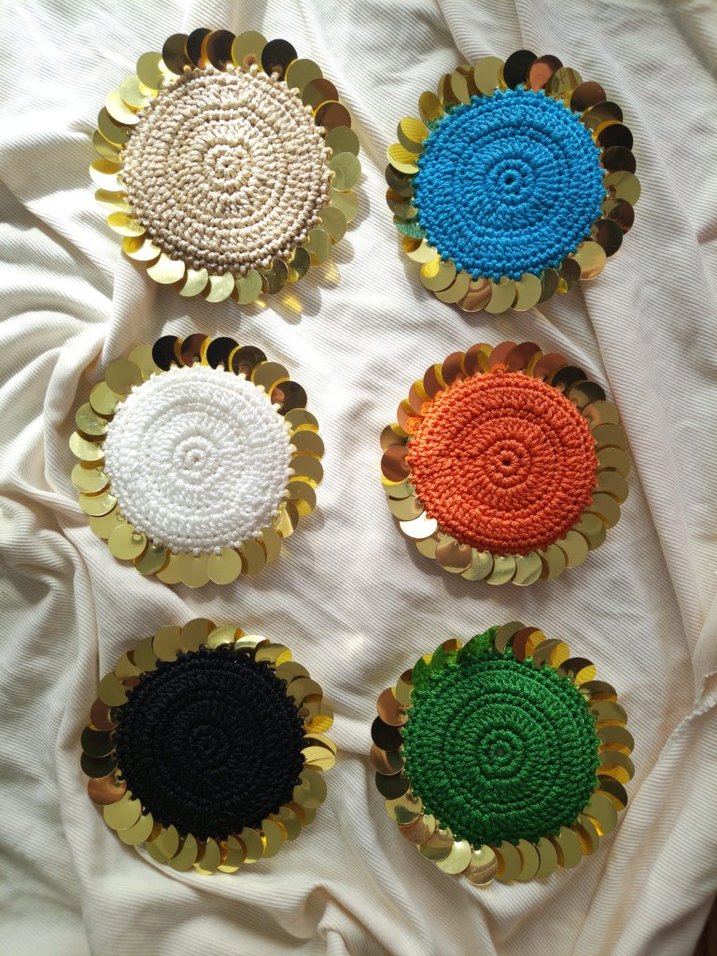 Bohem tarzda, renkli el örgüsü yuvarlak bardak altlıkları, parlak altın payetlerle çevrilidir, masanıza dekoratif bir dokunuş katar.