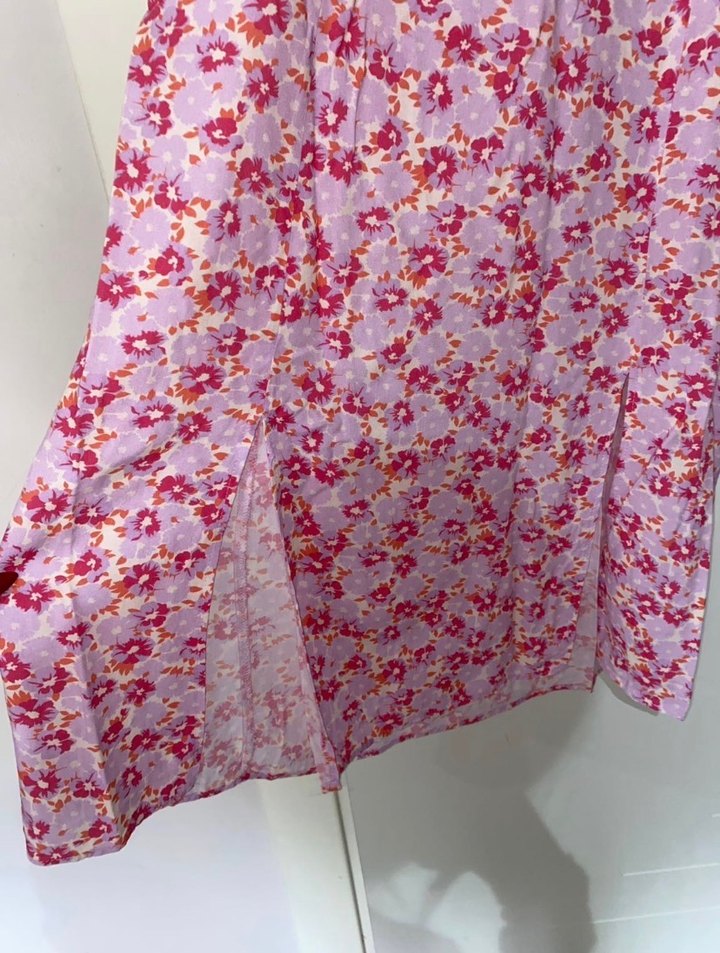 Yumuşak sentetik kumaştan, bohem tarzda, pastel mor tonlarında, fırfırlı, bol kesim uzun yırtmaçlı elbise