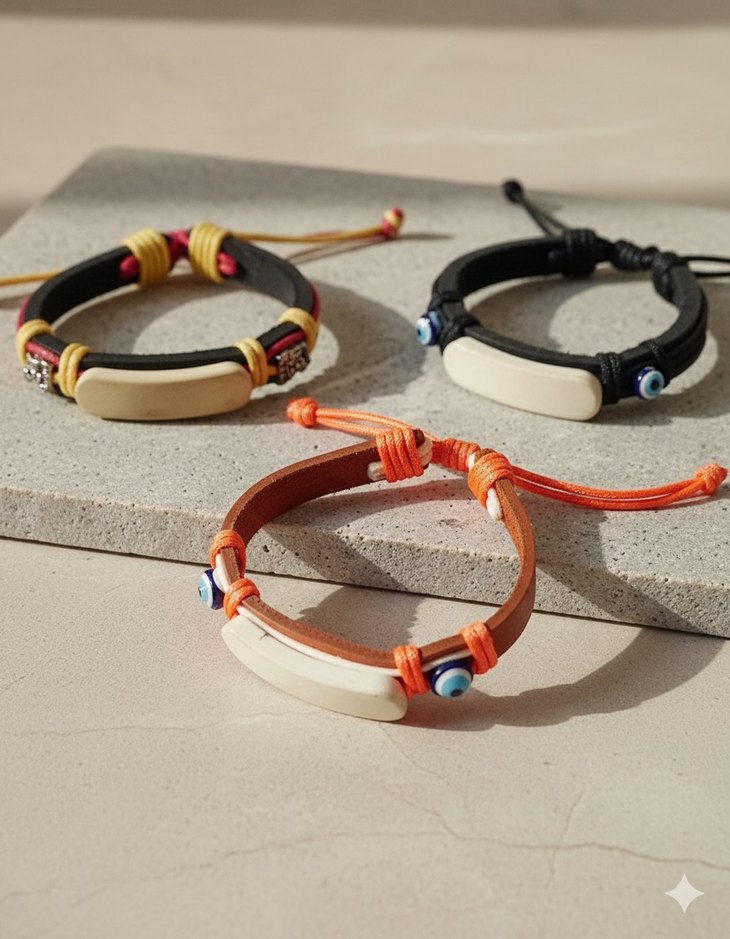 Renkli ipler ve nötr dikdörtgen detaylarla bohem ve retro tarzda, ayarlanabilir erkek bileklik seti.