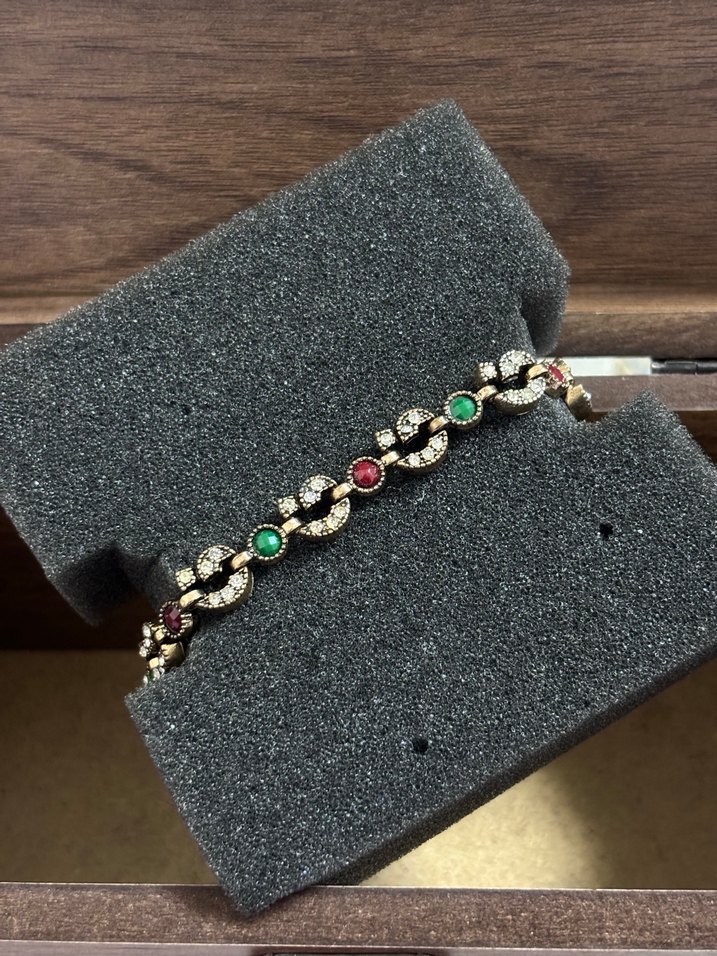Gündelik kullanıma uygun, koyu renkli çok renkli boncuklar ve işlemeli desene sahip bohem tarzı kadın bileklik.