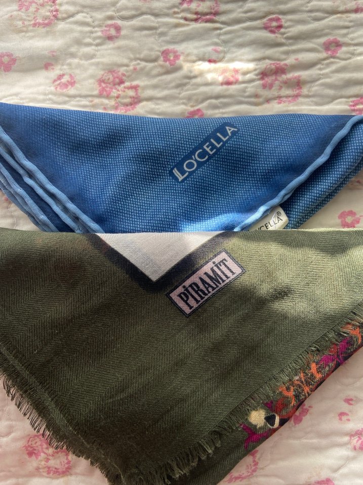 Çok renkli, dökümlü tasarımlı kadın eşarp. Koyu tonlarda, vintage bohem tarzı, yumuşak tekstil kumaşından üretilmiştir. Markalar: LO'CELLA, PIRAMiT.