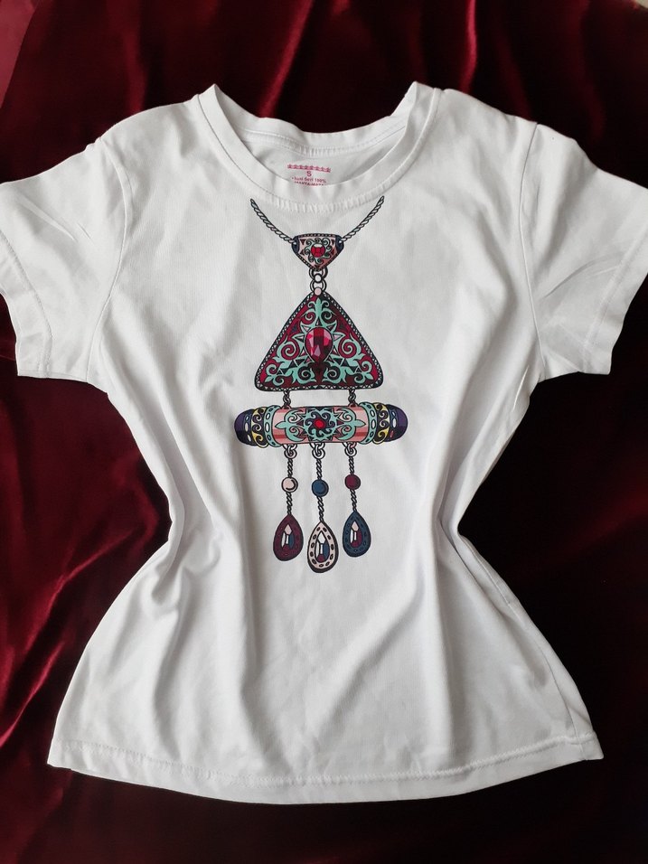 renkli bohem tarzı kadın tişörtü. Kısa kollu, yuvarlak yakalı ve bol kesimdir. pamuklu malzemeden yapılmıştır.