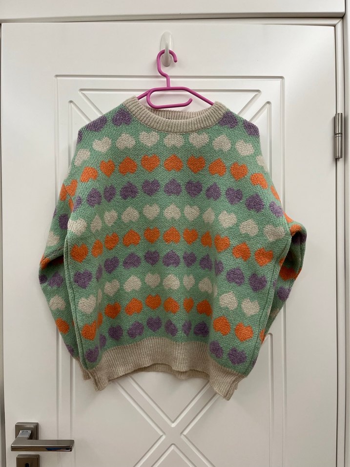 Bohem Renkli Kalp Desenli Kadın Triko Kazak
