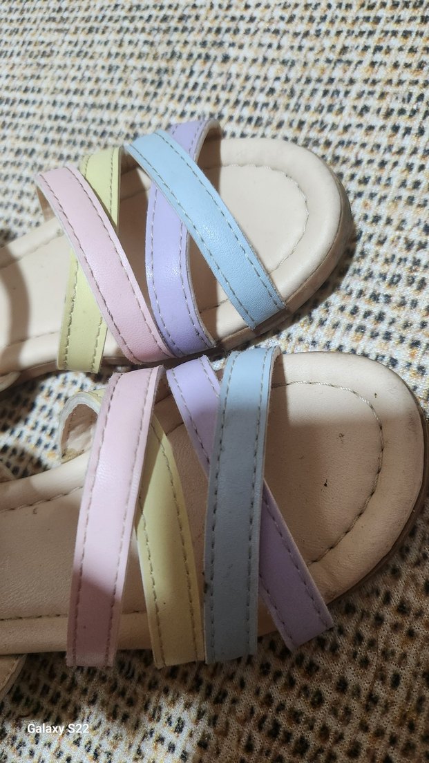 Bohem tarzı, pastel renkli bağlama desenli, tokalı kız çocuk sandaletleri, yumuşak kauçuk malzemeden üretilmiştir. 2 defa kullanıldı yepyeni silinmesi lazım kaçırmayın