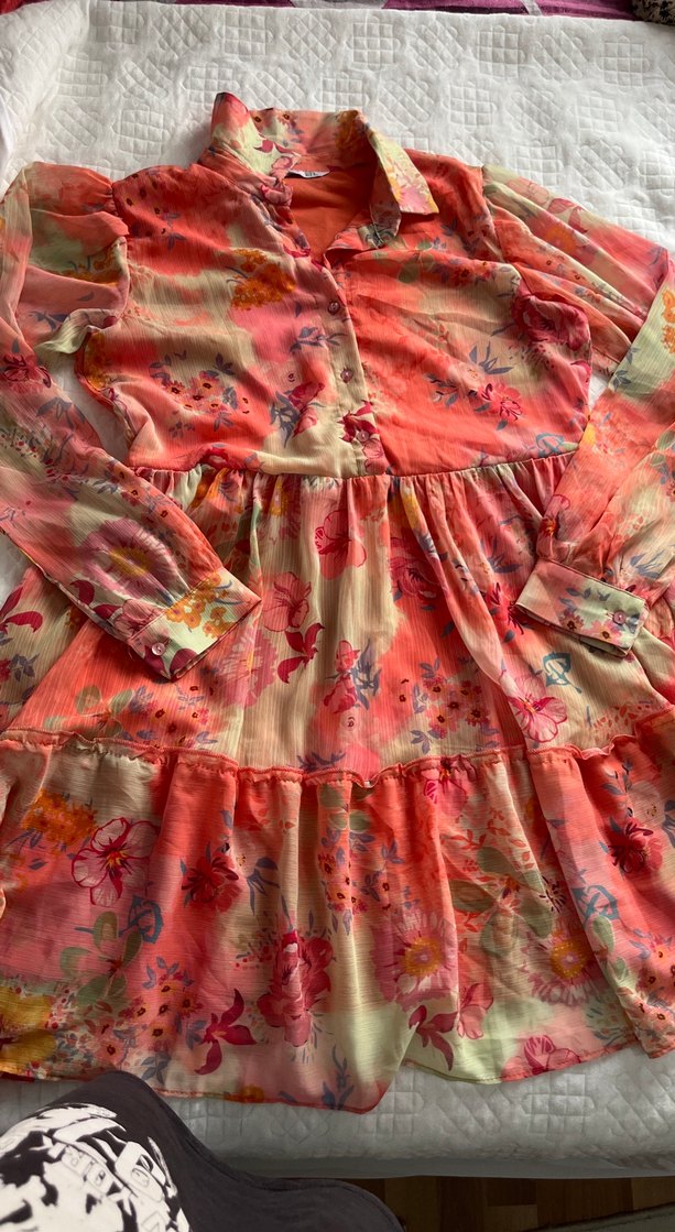 Bu kız elbisesi, salaş kesimi ve fırfır detayları ile kollu yakaya sahiptir. Yumuşak tekstil kumaştan olup pastel çok renkli batik desenlidir. Bohem tarzda, retro ve hippie havası taşır. Hiç kullanılmamıştır.S ve M beden mevcuttur.