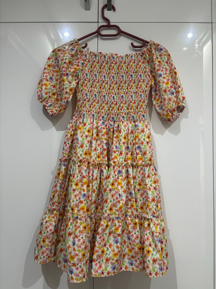 Bohem tarzda, kısa balon kollu ve fırfırlı detaylı midi elbise. Yumuşak sentetik kumaştan, pastel çok renkli batik desenli, günlük kullanıma uygun.