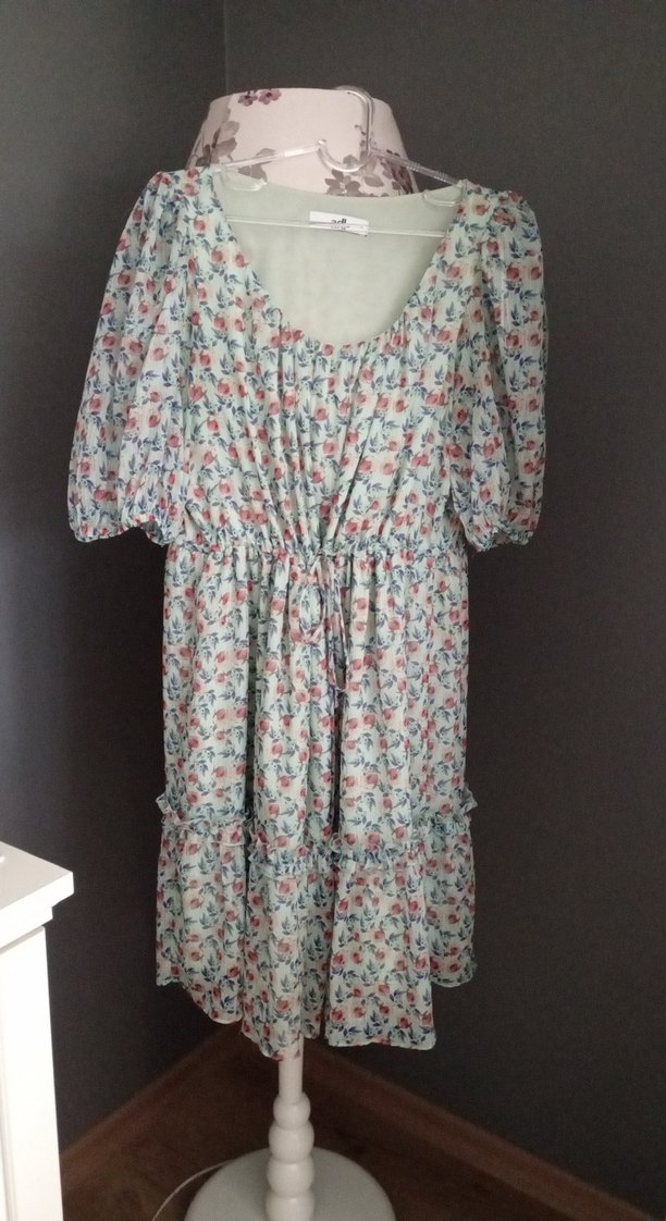 Bohem tarzda, bol kesim midi elbise. Kısa kollu, V yakalı, yumuşak sentetik kumaş ve çok renkli batik deseniyle fırfır detayları içerir. ürün bir kere giyilmiştir kusuru yoktur